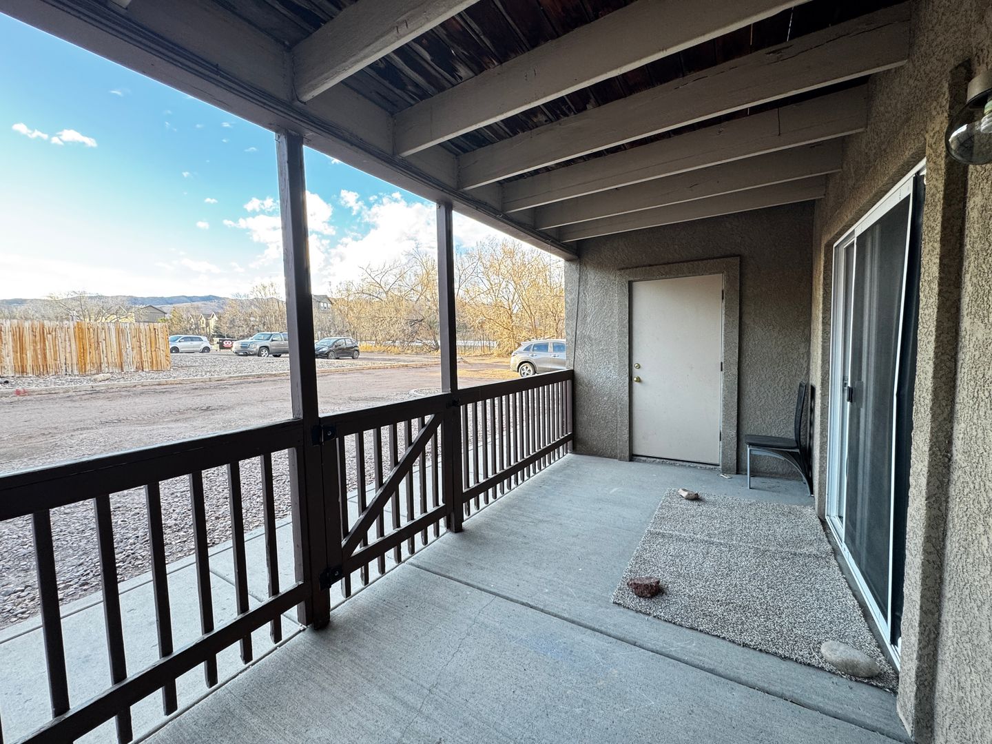 As you step into this charming unit, you're welcomed by a spacious living room featuring a cozy wood-burning fireplace, perfect for those chilly winter nights. The room flows into the kitchen that has a built in breakfast bar perfect for quick easy meals. Down the hall, you’ll find two generously sized bedrooms with ample closet space, along with a full bathroom. Off the living room you have a sliding glass door that leads to a private, covered concrete patio, ideal for relaxing or enjoying the outdoors. A gate from the patio provides convenient access to the parking lot. It is in a great central location, close to I-25 with easy access to the entire city. Additionally, the well-maintained community laundry area with coin-operated machines is just outside your door, simplifying laundry day. This spacious yet cozy 2-bedroom, 1-bathroom unit is ready for you to make it your home.
